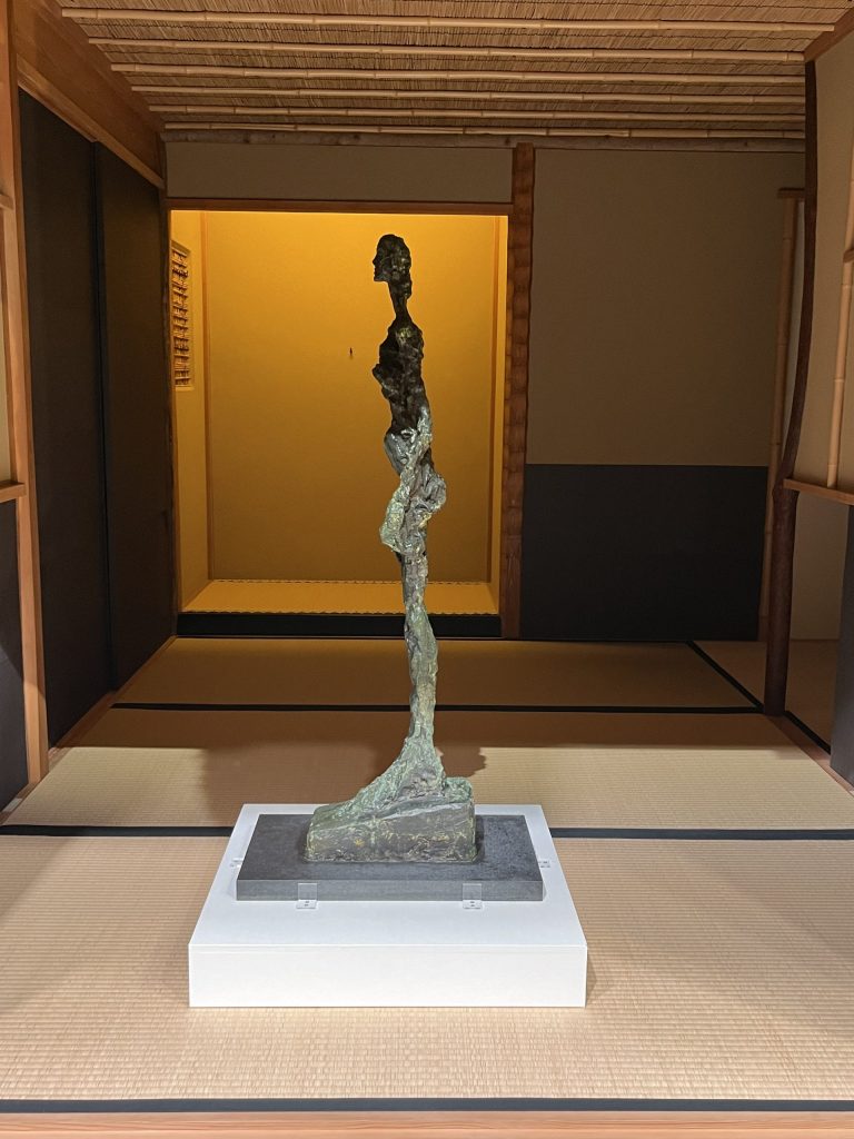 極度に余分な贅肉を削ぎ落とされ、痛々しく痩せ細った彫刻は、あるいは欲望や邪念を断ち切った仏教的なニュアンスに見えなくもない。ゆえに本展では、茶室「中之島玄庵」畳の間に展示した