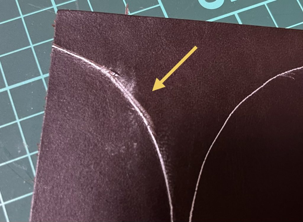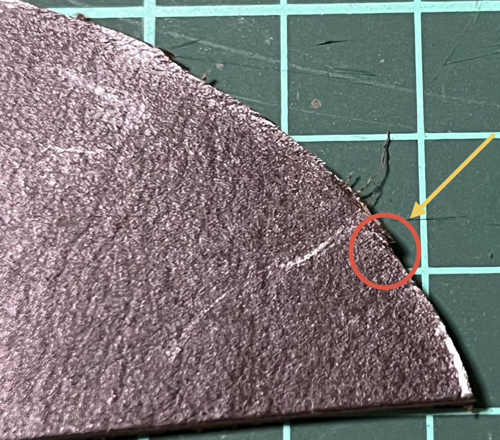 写真の赤い丸の箇所を見てもらうと、裁った後の革に段差ができている。