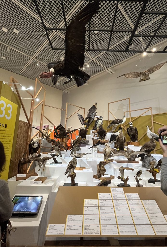 展示の後半にある開けた場所に、吊り標本含めて、34種類ものタカ目の標本が展示されている。
