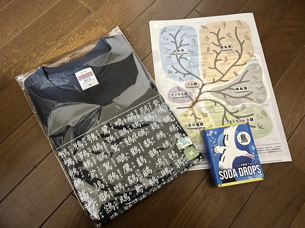 ここのショップでは鳥の系統樹のクリアファイルと、鳥の漢字が沢山書かれたTシャツを購入。